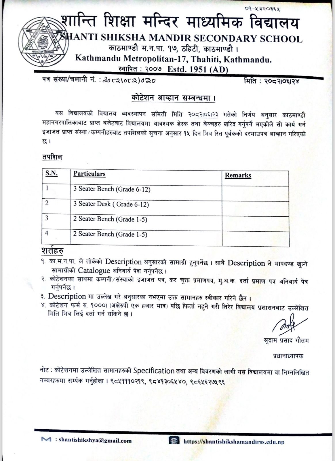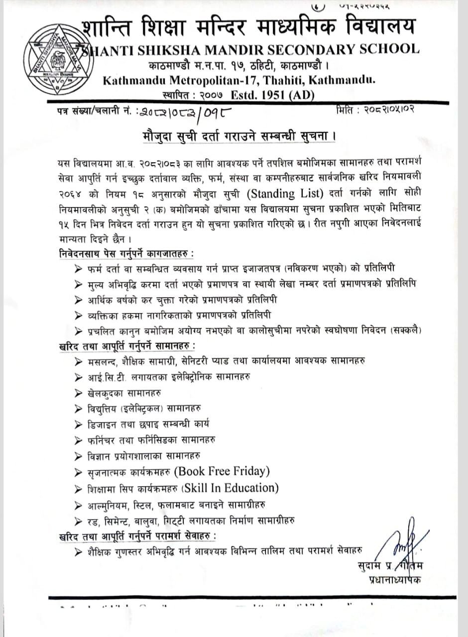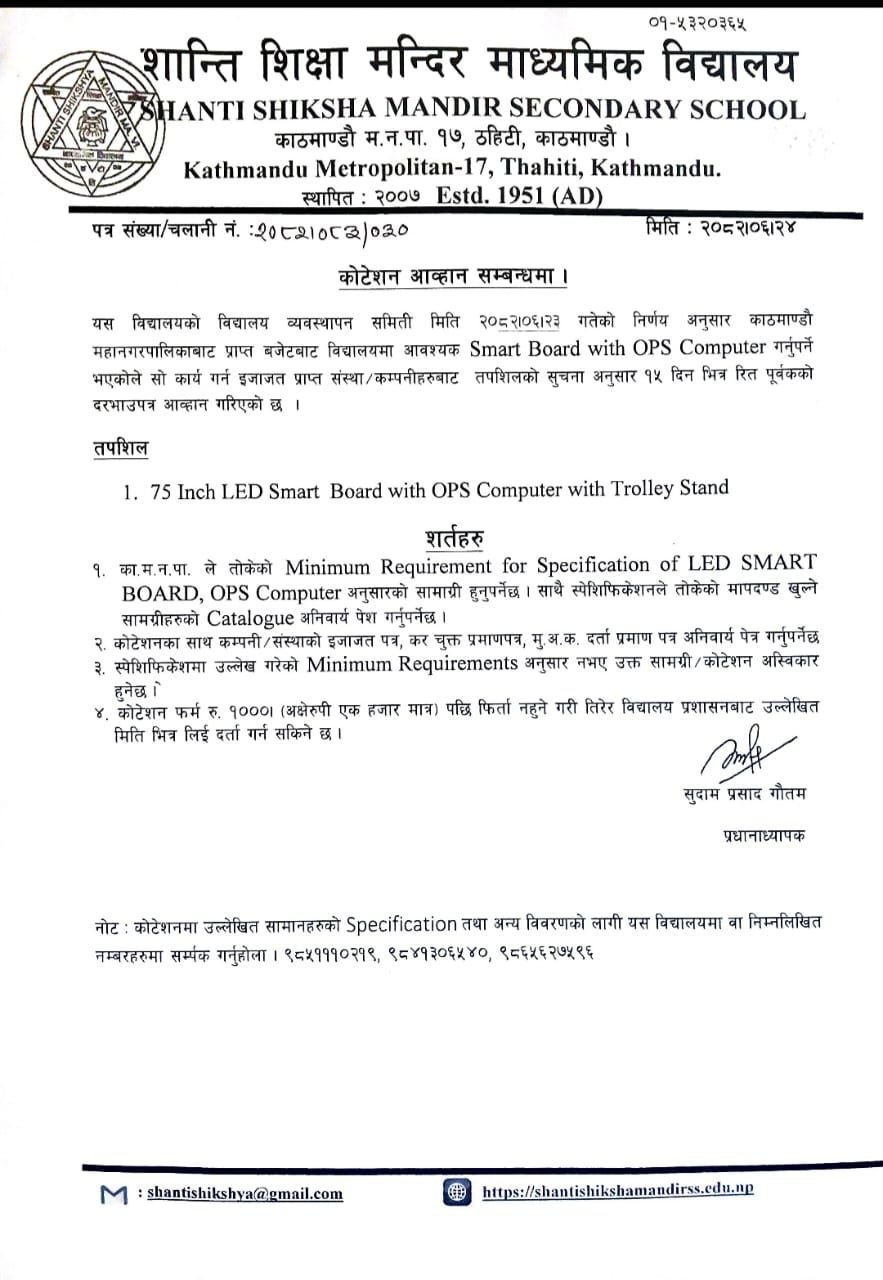 Shanti Shikshya Mandir Secondary School located now in the heart of Kathmandu Metropolitan City has its own historical background. This school was initially established as Shanti Shikshya Mandir Primary School in 2007 Falgun 20 with a pious aim of educating the local children of the community just after nation entered into the era of democracy in 2007 B.S after more than a century of autocratic rule of Rana regime After the downfall of Rana regime in 2007 B.S to bring awareness in the community in the local area of Thahity, motion picture was shown to the public by charging nominal amount of money. By the accumulated sum of money Rs.250/-by showing motion picture in the local community, this school was established on 20th Falgun, 2007 B.S through the initiation of ……